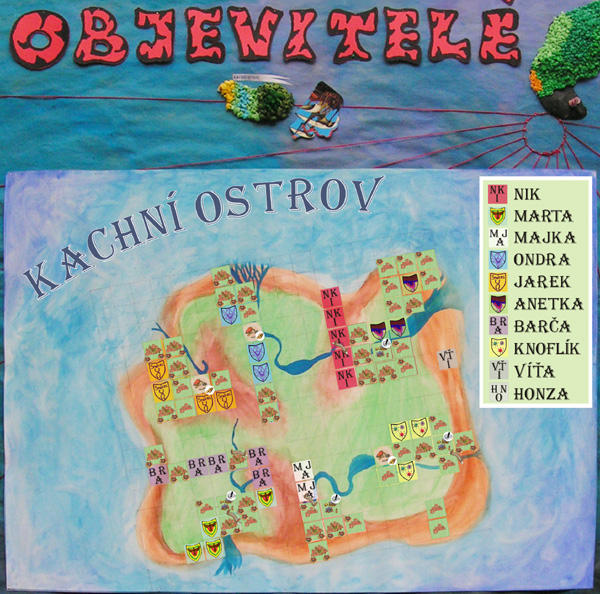 ![]() Se začátkem dlouhodobé hry jsme si v novém školním roce dali trochu načas. Střelecká soutěž znamenala pro zářijové schůzky především ténink střelby v různých disciplínách. Od 14. října do 1. listopadu probíhaly »přípravy na plavbu«. 8. listopadu 2006 jsme se konečně nalodili a vypluli. Postup a podrobnosti k plavbě, během níž jsme navštivili 16 ostrovů a potýkali se zrádnými útesy i piráty, a která skončila 11. dubna 2007 vám přiblíží »mapa z nástěnky«. Náše cíle se nečekaně změnily po ztroskotání u Kachního ostrova. 14. dubna jsme na »výpravě« zahájili průzkum ostrova. Od té doby jsme se, podle určených »pravidel«, věnovali jeho osidlování. 13. června jsme během schůzky svedli závěrečný »Boj o Vládce ostrova«. můžete níže nahlédnout, jak si kdo vedl při osidlování ostrova a jaké bylo jeho hodnocení před závěrečnou hrou. ![]()