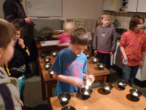 o planetě kde pracuje „lampář“ – ten kdo rozsvěcuje a zhasíná lampy. Mezitím jsme si chystali svoje lampy na stoly (čajovou svíčku v kelímku). A pak jsme jako lampáři na kontinentech na Zemi postupně svíčky zapalovali.