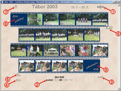 Na obrázku je příklad okna pro prohlížení fotek. Některé prvky jsou na něm vždy: Políčka filmu s náhledy obrázků, a vše označeno čísly 1-7. Prvky 8-9 na obrazovce být nemusí. Obrázky můžete prohlížet kliknutím levým tlačítkem myši na náhled, nebo pomocí prvků 3 a 4. Číslo 1 označuje ovládací prvky pro postupné přepínání mezi dny. Uprostřed je číslo právě zobrazeného dne – kliknete-li na něj, přesunete se na okno s popisem tábora s odkazy na všechny dny. Číslo 2 označuje informační blok, kde je uveden zobrazovaný den a počet snímků. Je-li uvedeno více čísel, znamená to, že fotky jsou rozděleny na více obrazovek (viz. prvky 8 a 9). Počet snímků zobrazených na obrazovce je černou barvou. Číslo 3 slouží pro postupné prohlížení právě zobrazených fotek od první. Číslo 4 slouží pro postupné prohlížení právě zobrazených fotek od poslední. Číslo 5 je ovládací prvek pro přesun na úvodní stránku, k odkazům na jednotlivé dny. Číslo 6 zůstanete-li stát kursorem myši na náhledu fotky, objeví se po chvíli číslo této fotky (není-li tato funkce v prohlížeči vypnuta). Číslo 7 zobrazí tuto stránku s nápovědou. Číslo 8 zobrazí následující stránku náhledů fotek z právě prohlíženého dne. Číslo 9 zobrazí předcházející stránku náhledů fotek z právě prohlíženého dne. |