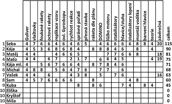 1. – vymalování Gulivera2. – výroba a vypouštění vlaštovek 3. – výroba a vypouštění foukaných raket 4. – výroba paliva a vypouštění octových raket 5. – zvládnutí výrobního postupu podle vzoru 6. – ovládání gyroskopu 7. – rychlost reakce 8. – správné pořadí 9. – přesná stavba 10. – raketa dle plánu 11. – DOMINO 12. – lůžko motoru 13. – stabilizátory 14. – hlavice/stuha 15. – lepení stabilizátorů 16. – montáž vodítek 17. – barvení hlavice 18. – ZÁVĚREČNÁ | |
